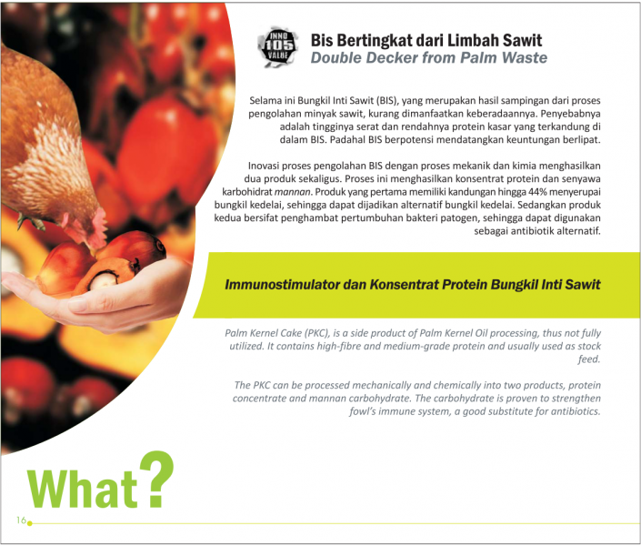 Bis Bertingkat dari Limbah SawitDouble Decker from Palm WasteImmunostimulator dan Konsentrat Protein Bungkil Inti Sawit Status Paten: Telah Terdaftar Kesiapan Inovasi: * Prototype Kerjasama Bisnis: ** Luas Peringkat Inovasi: ** Luas | |