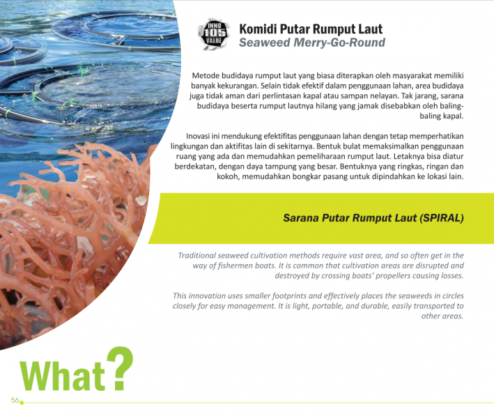 Berakit-Rakit Dahulu, Sukses Panen KemudianNet-Raft for Successful Seaweed HarvestAlat Budidaya Rumput Laut Terproteksi yang Efektif dan Efisien Status Paten: Dalam Proses Pengajuan Kesiapan Inovasi: * Prototype Kerjasama Bisnis: ** Luas Peringkat Inovasi: ** Luas | |