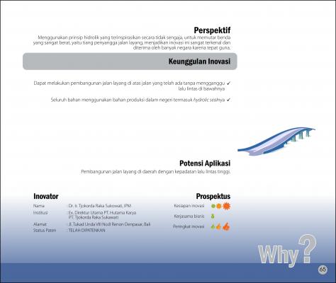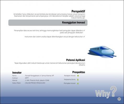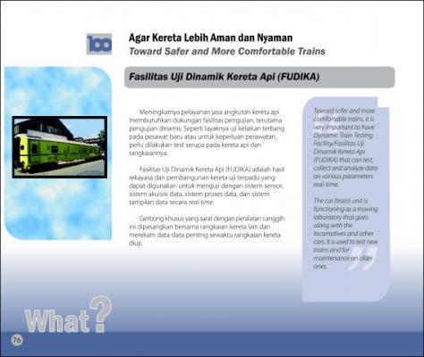 Agar Kereta Lebih Aman dan NyamanToward Safer and More Comfortable TrainsFasilitas Uji Dinamik Kereta Api (FUDIKA) Status Paten: Dalam Proses Pengajuan Kesiapan Inovasi: * Prototype Kerjasama Bisnis: * Terbatas Peringkat Inovasi: * Terbatas | |