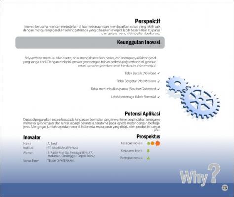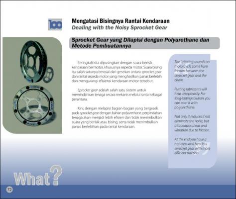 Mengatasi Bisingnya Rantai KendaraanDealing with the Noisy Sprocket GearSprocket Gear yang Dilapisi dengan Polyurethane dan Metode Pembuatannya Status Paten: Telah Terdaftar Kesiapan Inovasi: *** Telah Dikomersialkan Kerjasama Bisnis: * Terbatas Peringkat Inovasi: * Terbatas | |
