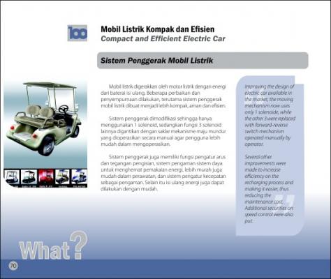 Mobil Listrik Kompak dan EfisienCompact and Efficient Electric CarSistem Penggerak Mobil Listrik Status Paten: Telah Terdaftar Kesiapan Inovasi: *** Telah Dikomersialkan Kerjasama Bisnis: *** Terbuka Peringkat Inovasi: *** Terbuka | |