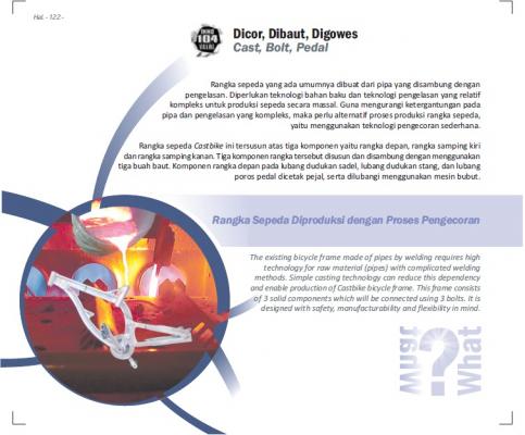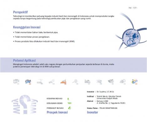 Dicor, Dibaut, DigowesCast, Bolt, PedalRangka Sepeda Diproduksi dengan Proses Pengecoran Status Paten: Telah Terdaftar Kesiapan Inovasi: * Prototype Kerjasama Bisnis: * Terbatas Peringkat Inovasi: * Terbatas | |