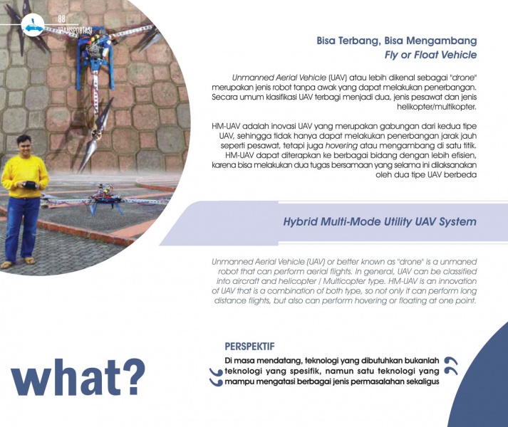 Bisa Terbang, Bisa MengambangFly or Float VehicleHybrid Multi-Mode Utility UAV System Status Paten: Kesiapan Inovasi: Kerjasama Bisnis: *** Terbuka Peringkat Inovasi: *** Terbuka | |