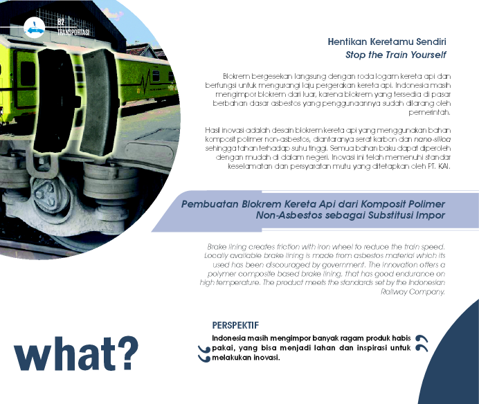 Hentikan Keretamu SendiriStop the Train YourselfPembuatan Blokrem Kereta Api dari Komposit Polimer Non-Asbestos sebagai Substitusi Impor Status Paten: Kesiapan Inovasi: * Prototype Kerjasama Bisnis: *** Terbuka Peringkat Inovasi: *** Terbuka | |