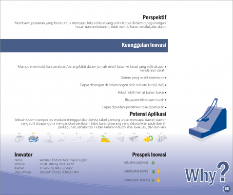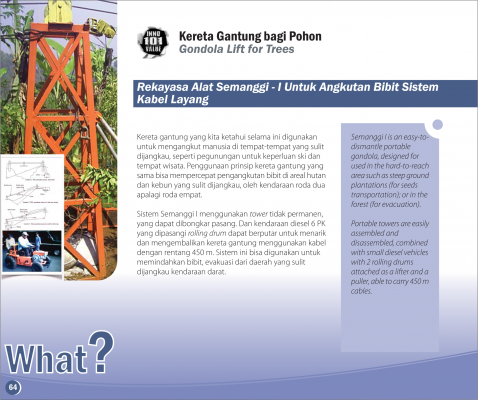 Kereta Gantung bagi PohonGondola Lift for TreesRekayasa Alat Semanggi - I Untuk Angkutan Bibit Sistem Kabel Layang Status Paten: Dalam Proses Pengajuan Kesiapan Inovasi: * Prototype Kerjasama Bisnis: ** Luas Peringkat Inovasi: ** Luas | |