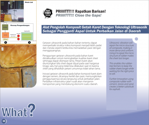 PRIIIITTT!!! Rapatkan Barisan!PRIIIITTT!!! Close the Gaps!Alat Pengolah Komposit Getah Karet Dengan Teknologi Ultrasonik Sebagai Pengganti Aspal Untuk Perbaikan Jalan di Daerah Status Paten: Dalam Proses Pengajuan Kesiapan Inovasi: * Prototype Kerjasama Bisnis: ** Luas Peringkat Inovasi: ** Luas | |