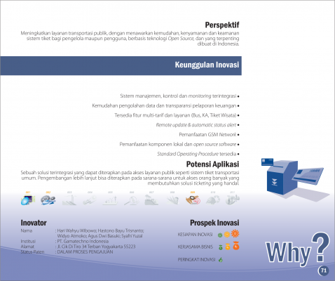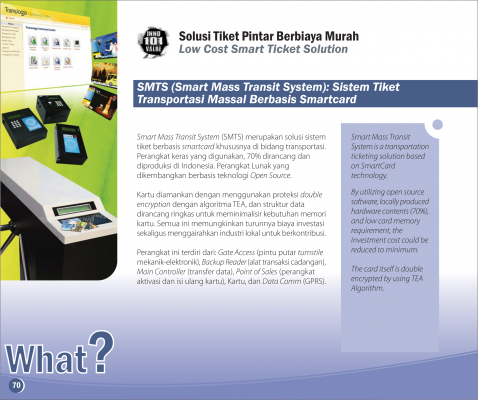 Solusi Tiket Pintar Berbiaya MurahLow Cost Smart Ticket SolutionSMTS (Smart Mass Transit System): Sistem Tiket Transportasi Massal Berbasis Smartcard Status Paten: Dalam Proses Pengajuan Kesiapan Inovasi: *** Telah Dikomersialkan Kerjasama Bisnis: *** Terbuka Peringkat Inovasi: *** Terbuka | |