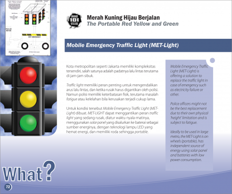 Merah Kuning Hijau BerjalanThe Portable Red Yellow and GreenMobile Emergency Traffic Light (MET-Light) Status Paten: Dalam Proses Pengajuan Kesiapan Inovasi: * Prototype Kerjasama Bisnis: *** Terbuka Peringkat Inovasi: *** Terbuka | |