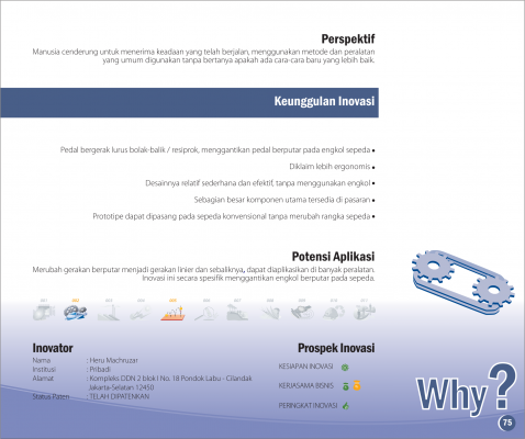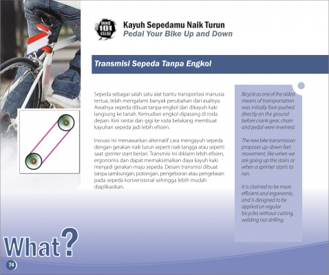 Kayuh Sepedamu Naik TurunPedal Your Bike Up and DownTransmisi Sepeda Tanpa Engkol Status Paten: Telah Terdaftar Kesiapan Inovasi: * Prototype Kerjasama Bisnis: ** Luas Peringkat Inovasi: ** Luas | |
