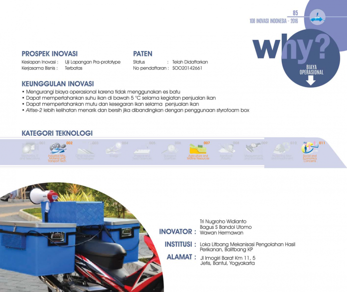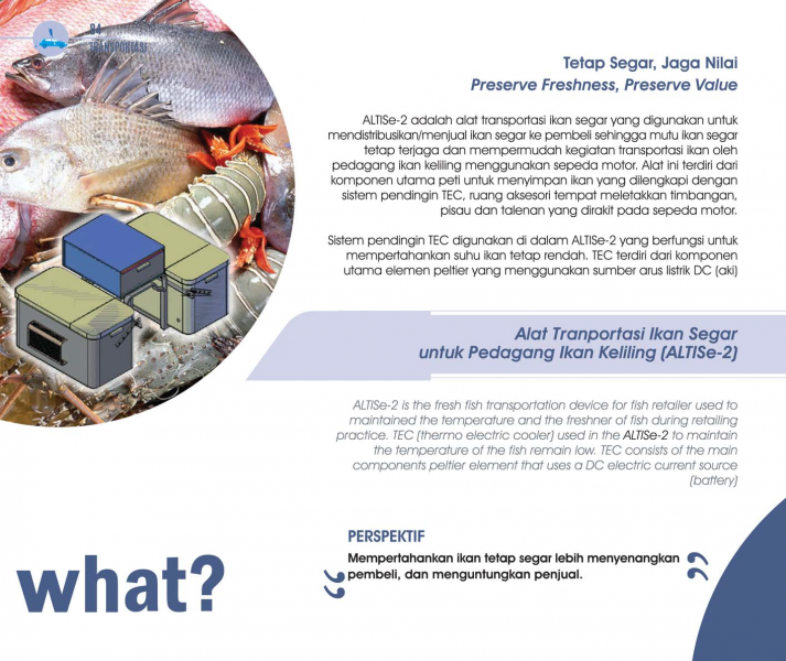 Tetap Segar, Jaga NilaiPreserve Freshness, Preserve ValueAlat Tranportasi Ikan Segar untuk Pedagang Ikan Keliling (ALTISe-2) Status Paten: Telah Terdaftar Kesiapan Inovasi: Kerjasama Bisnis: ** Luas Peringkat Inovasi: ** Luas | |
