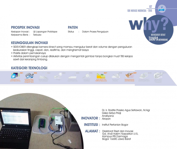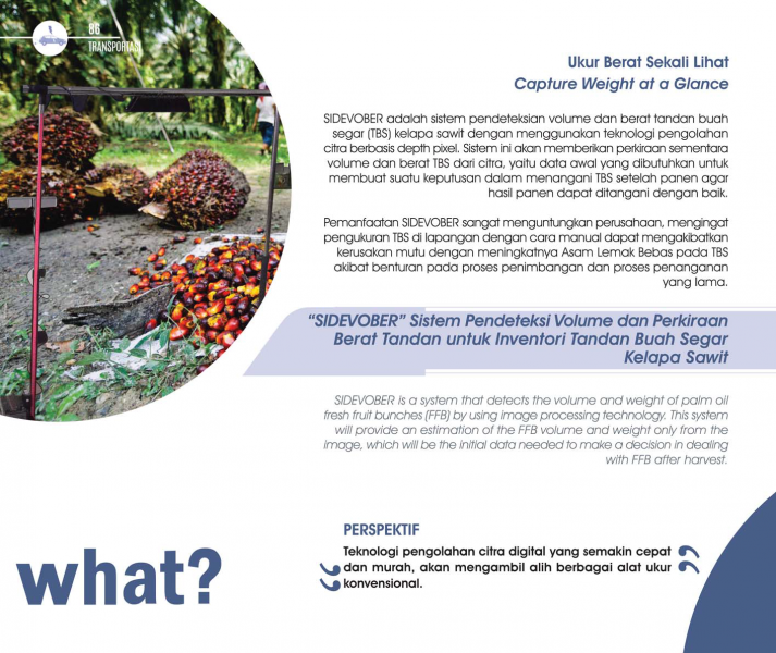 Ukur Berat Sekali LihatCapture Weight at a Glance"SIDEVOBER" Sistem Pendeteksi Volume dan Perkiraan Berat Tandan untuk Inventori Tandan Buah Segar Kelapa Sawit Status Paten: Dalam Proses Pengajuan Kesiapan Inovasi: Kerjasama Bisnis: *** Terbuka Peringkat Inovasi: *** Terbuka | |