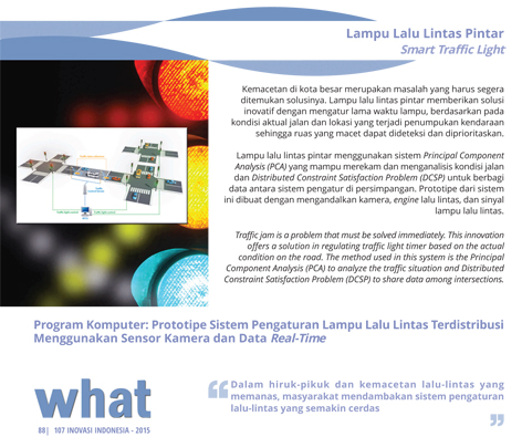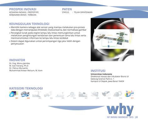 Lampu Lalu Lintas PintarSmart Traffic LightProgram Komputer: Prototipe Sistem Pengaturan Lampu Lalu Lintas Terdistribusi Menggunakan Sensor Kamera dan Data Real-Time Status Paten: Telah Terdaftar Kesiapan Inovasi: Kerjasama Bisnis: * Terbatas Peringkat Inovasi: * Terbatas | |
