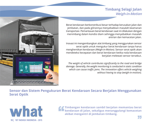 Timbang Selagi JalanWeigh-in-MotionSensor dan Sistem Pengukuran Berat Kendaraan Secara Berjalan Menggunakan Serat Optik Status Paten: Telah Terdaftar Kesiapan Inovasi: Kerjasama Bisnis: ** Luas Peringkat Inovasi: ** Luas | |