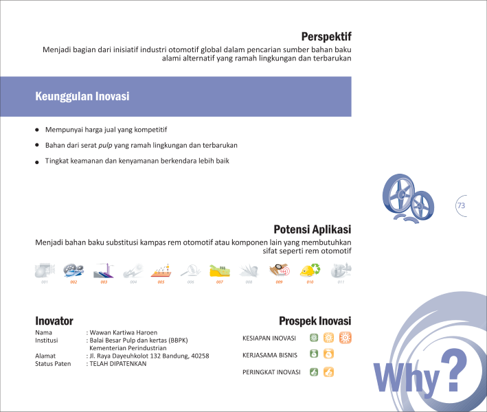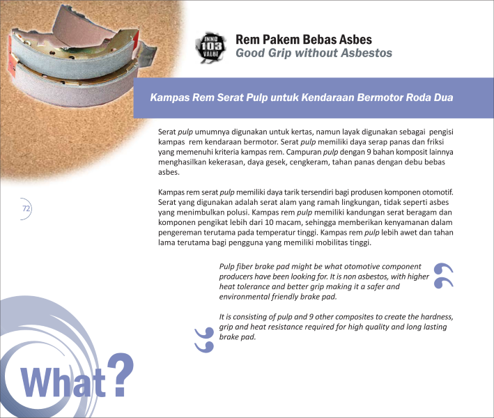 Rem Pakem Bebas AsbesGood Grip without AsbestosKampas Rem Serat Pulp untuk Kendaraan Bermotor Roda Dua Status Paten: Telah Terdaftar Kesiapan Inovasi: *** Telah Dikomersialkan Kerjasama Bisnis: ** Luas Peringkat Inovasi: ** Luas | |