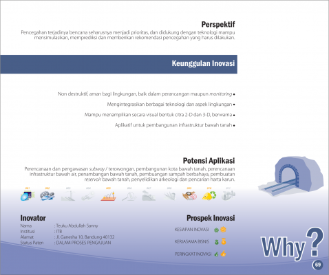 'USG' 3D Perut GunungMountain Cavity 3D 'USG'Visualisasi 3-D Stereografi Struktur Tanah untuk Rekonstruksi, Pemantauan dan Antisipasi Bencana Terowongan Bawah Tanah Status Paten: Dalam Proses Pengajuan Kesiapan Inovasi: ** Siap Dikomersialkan Kerjasama Bisnis: ** Luas Peringkat Inovasi: ** Luas | |