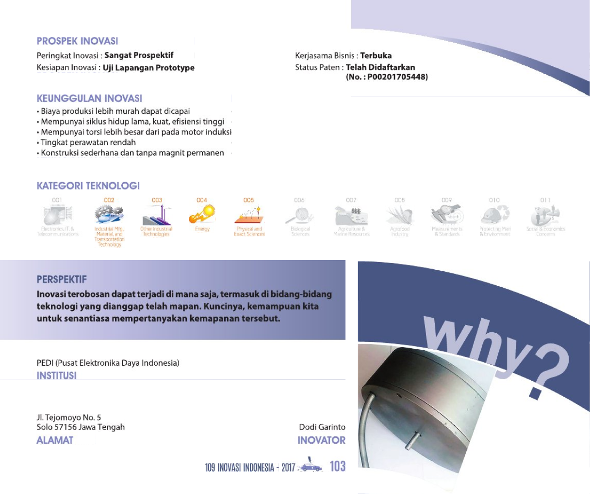 Yang Baru dari Motor ListrikThe New Breed of Electric MotorMotor Listrik AC Serba Guna Status Paten: Telah Terdaftar Kesiapan Inovasi: Kerjasama Bisnis: *** Terbuka Peringkat Inovasi: *** Terbuka |