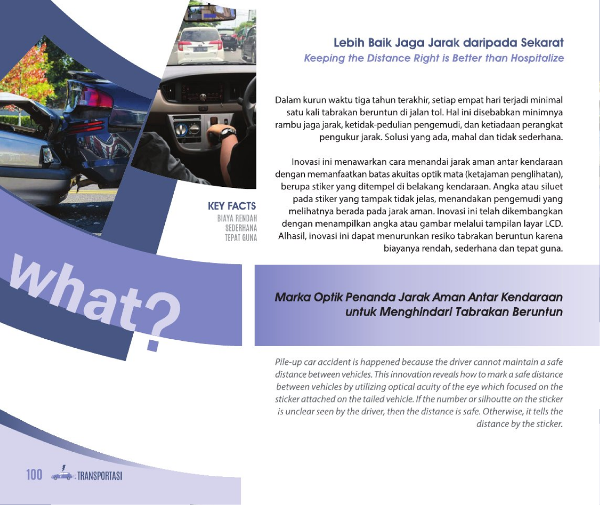 Lebih Baik Jaga Jarak daripada SekaratKeeping the Distance Right is Better than HospitalizeMarka Optik Penanda Jarak Aman Antar Kendaraan untuk Menghindari Tabrakan Beruntun Status Paten: Telah Terdaftar Kesiapan Inovasi: Kerjasama Bisnis: *** Terbuka Peringkat Inovasi: *** Terbuka | |