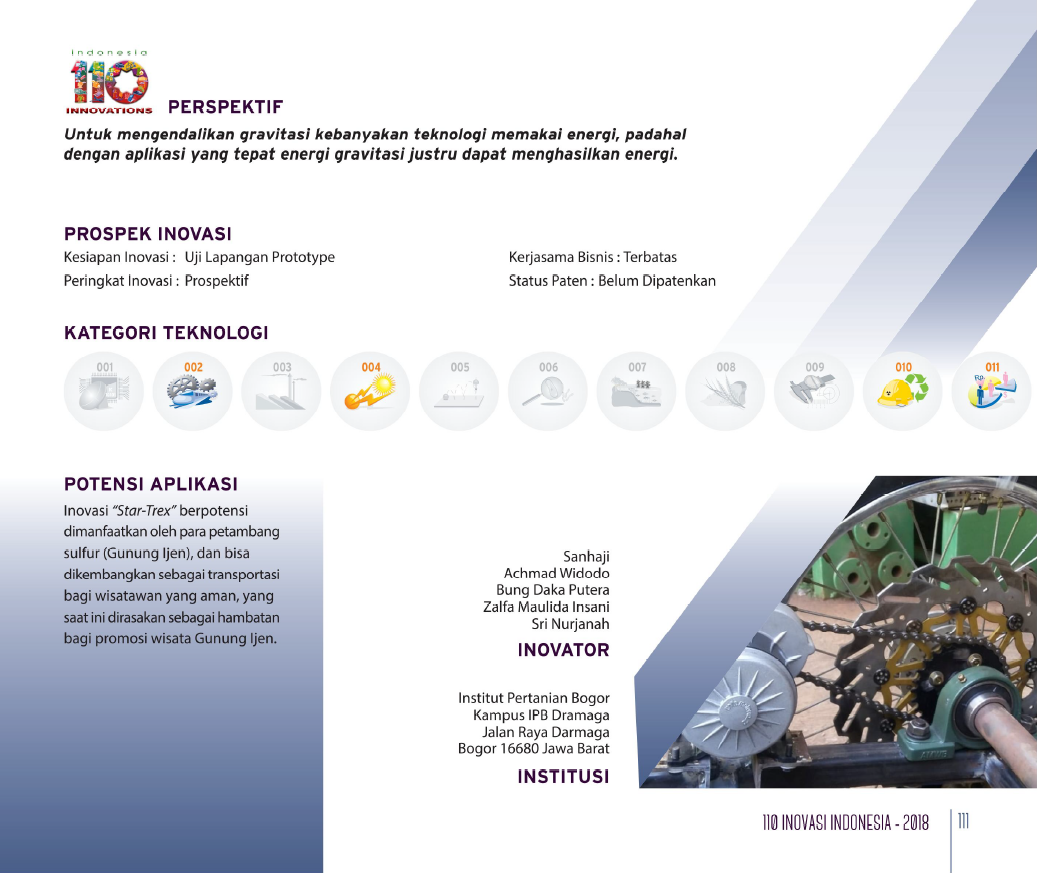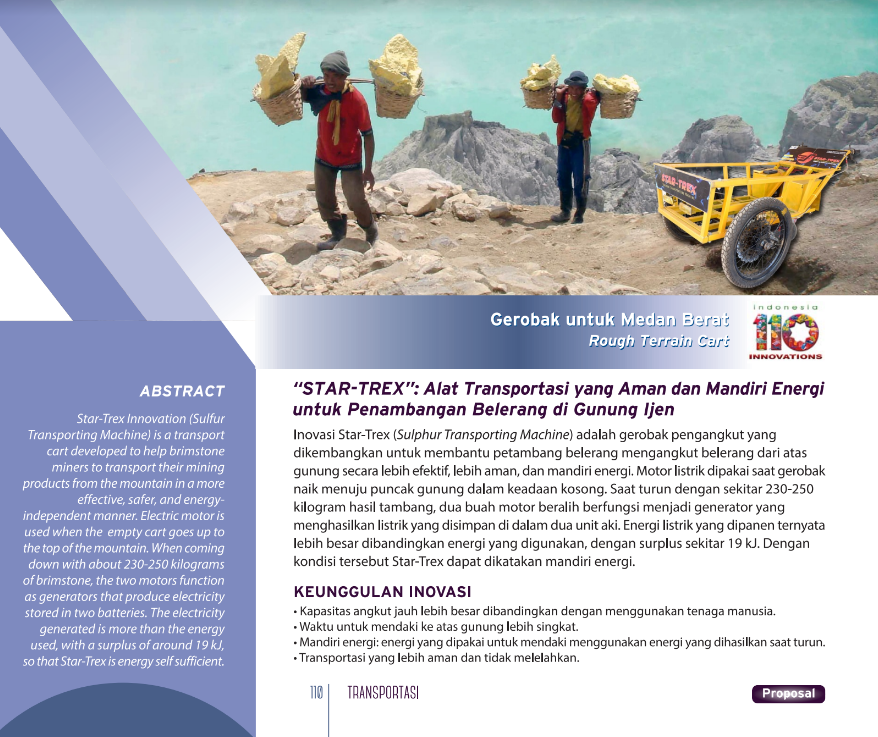 Gerobak untuk Medan BeratRough Terrain Cart"STAR-TREX": ALAT TRANSPORTASI YANG AMAN DAN MANDIRI ENERGI UNTUK PENAMBANGAN BELERANG DI GUNUNG IJEN Status Paten: Belum Didaftarkan Kesiapan Inovasi: * Prototype Kerjasama Bisnis: * Terbatas Peringkat Inovasi: * Terbatas | |