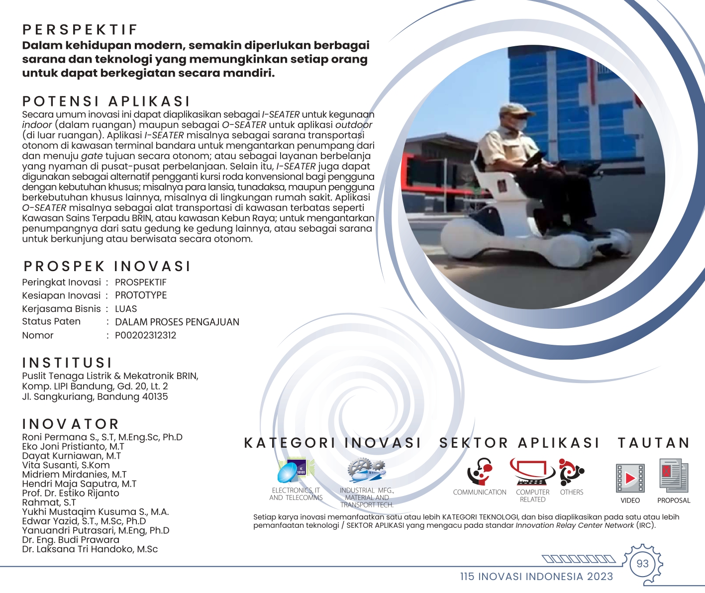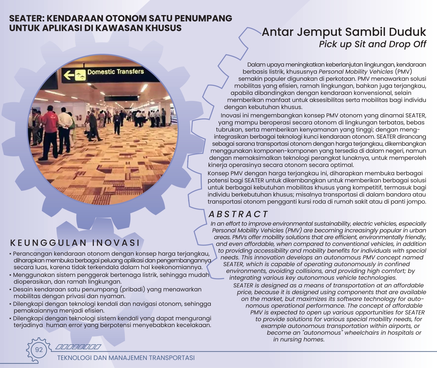 (DONE-BATCH5-DRAFT-06) Antar Jemput Sambil DudukPick up Sit and Drop OffSEATER: KENDARAAN OTONOM SATU PENUMPANG UNTUK APLIKASI DI KAWASAN KHUSUS Status Paten: Dalam Proses Pengajuan Kesiapan Inovasi: * Prototype Kerjasama Bisnis: ** Luas Peringkat Inovasi: ** Luas | |