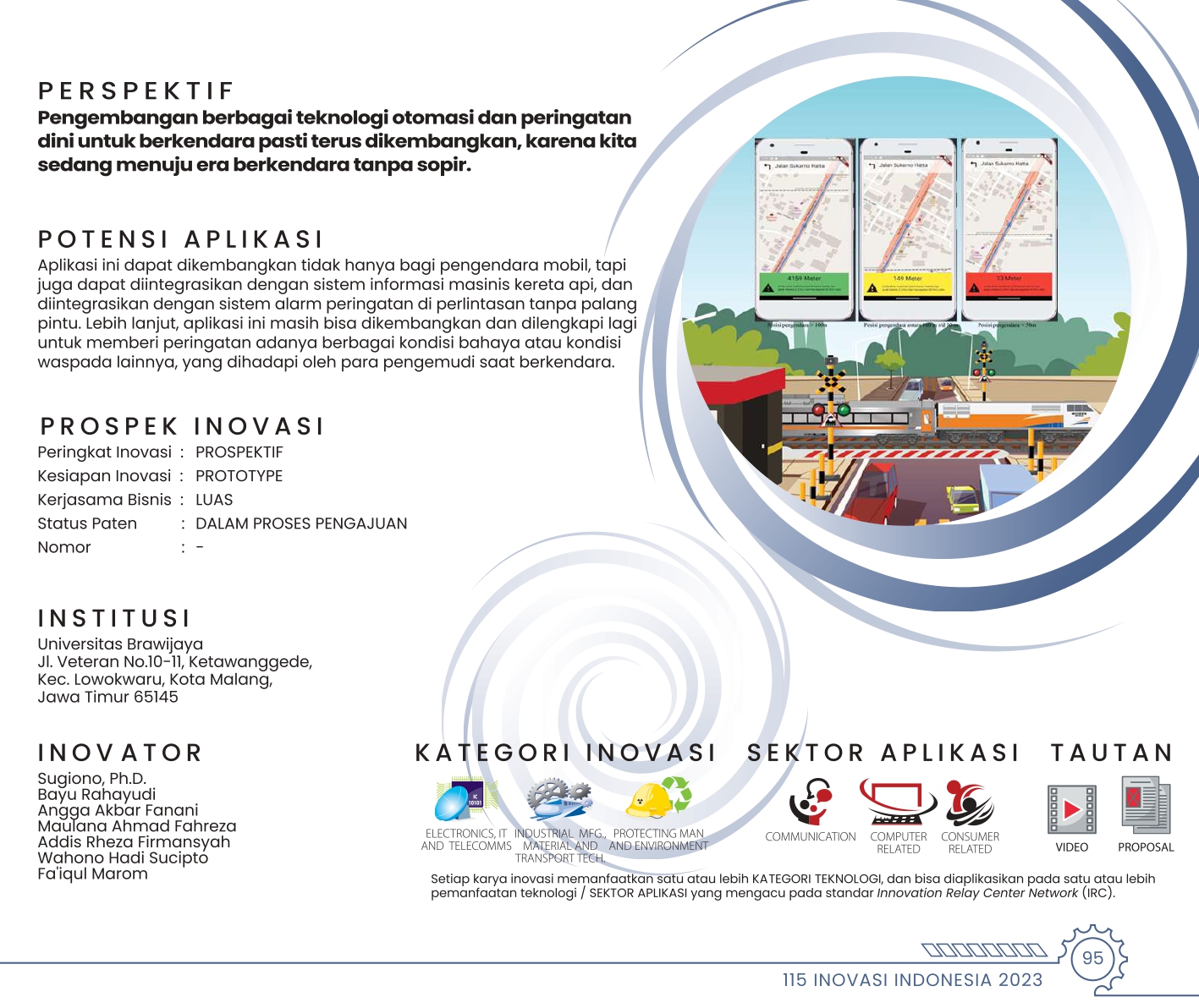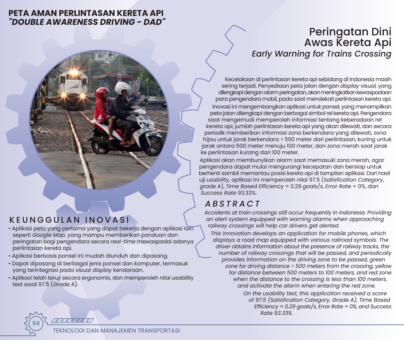 Peringatan Dini Awas Kereta ApiEarly Warning for Trains CrossingPETA AMAN PERLINTASAN KERETA API "DOUBLE AWARENESS DRIVING - DAD" Status Paten: Dalam Proses Pengajuan Kesiapan Inovasi: * Prototype Kerjasama Bisnis: ** Luas Peringkat Inovasi: ** Luas | |