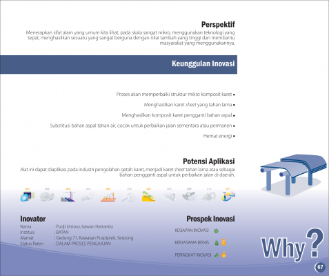 Aspal nan PraktisPractical AsphaltPengembangan Polimer Termoplastik sebagai Pengemas Aspal Status Paten: Telah Terdaftar Kesiapan Inovasi: * Prototype Kerjasama Bisnis: * Terbatas Peringkat Inovasi: * Terbatas | |
