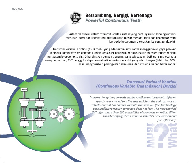 Bersambung, Bergigi, BertenagaPowerful Continuous TeethTransmisi Variabel Kontinu (Continuous Variable Transmission) Bergigi Status Paten: Telah Terdaftar Kesiapan Inovasi: * Prototype Kerjasama Bisnis: *** Terbuka Peringkat Inovasi: *** Terbuka | |